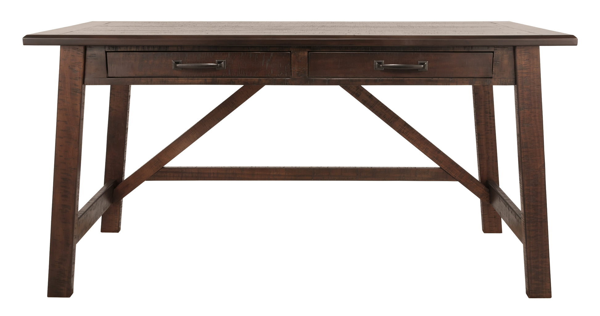 Leaning toward a casually cool look with a touch of rustic industrial flair? This home office desk with canted legs takes a fresh stance on style. Two smooth-gliding drawers with dovetail construction reflect high quality that never goes out of fashion. Saw marks infuse a touch of rich distressing. Antiqued sculptural pulls provide the finishing touch.