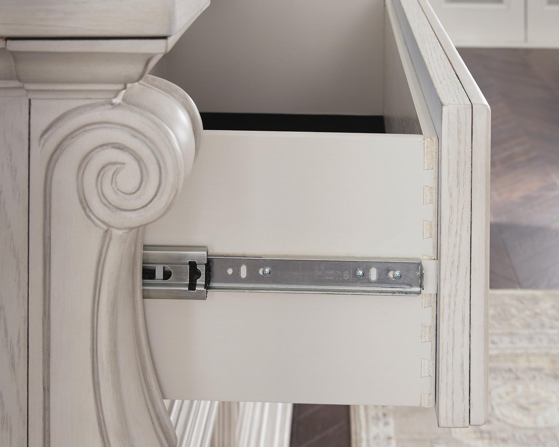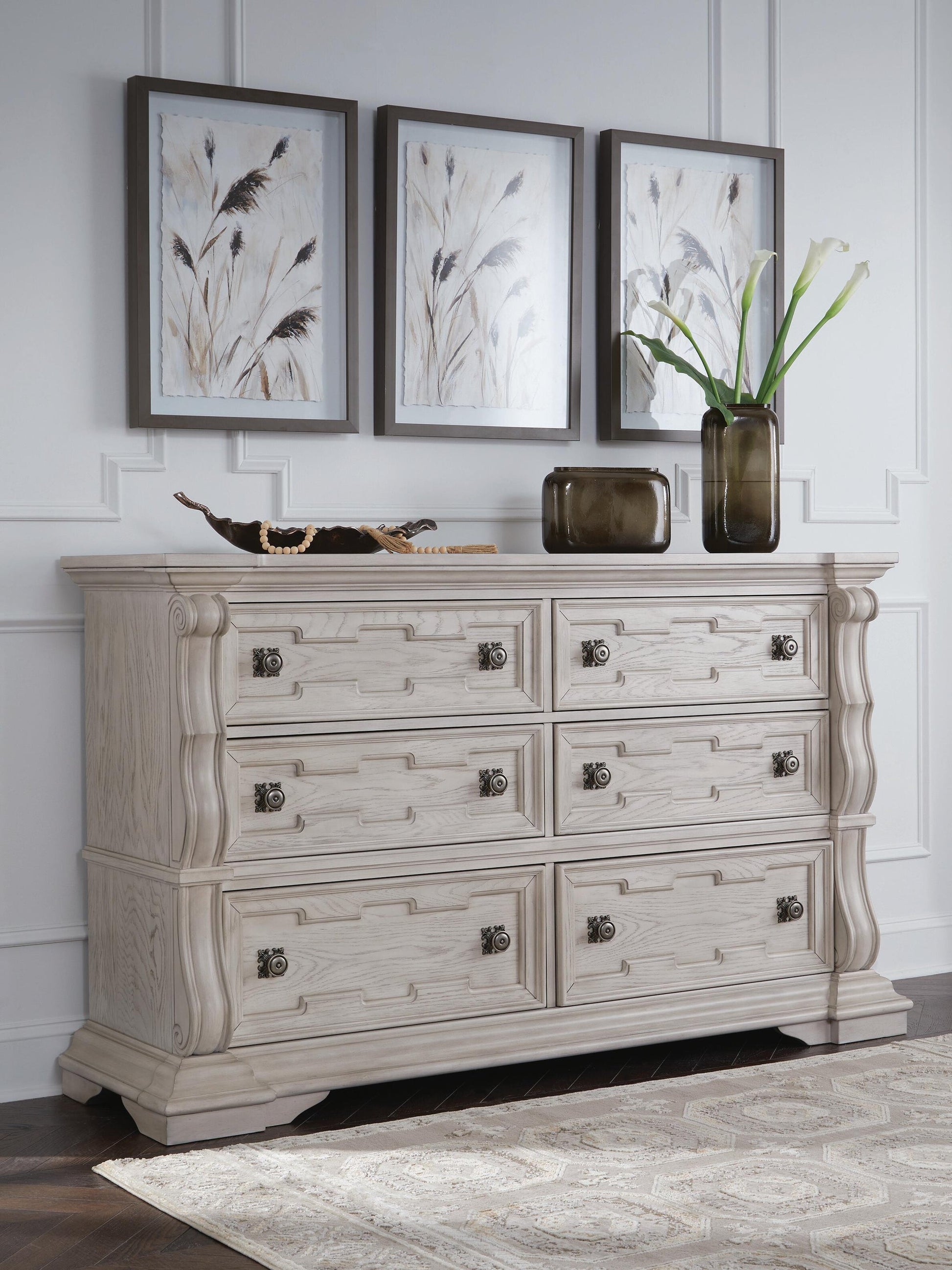 Inspired by the grandeur and grace of European traditional style, this opulent dresser is nothing short of stunning. Its large-scale decorative scrolled pilasters, along with an ash swirl border and walnut inlay crowning the top, are sure to make a sophisticated statement in your restful retreat. A timeless antiqued white coloration and bronze-tone drawer pulls lend an air of subtle elegance to this sumptuous piece.