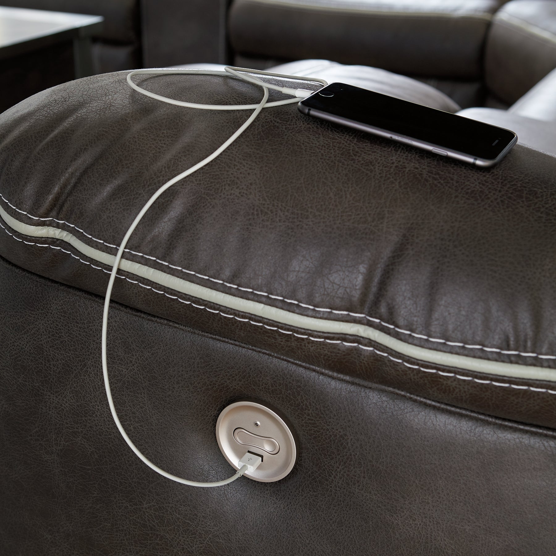 You could play it safe. Or you could choose to stand out in the crowd with this brilliantly styled sectional with power. Ultra cool, ultra contemporary and ultra comfortable, this fashion-forward sectional sports a fabulous faux leather enhanced with contrasting stitching that’s right on point. Rest assured, sumptuous pillow top armrests and sleek channel cushioning feel every bit as good as they look. Enlightened elements include a power control with USB plug-in and blue LED lighting (by the cup holders) to create a home theater experience worthy of A-listers.