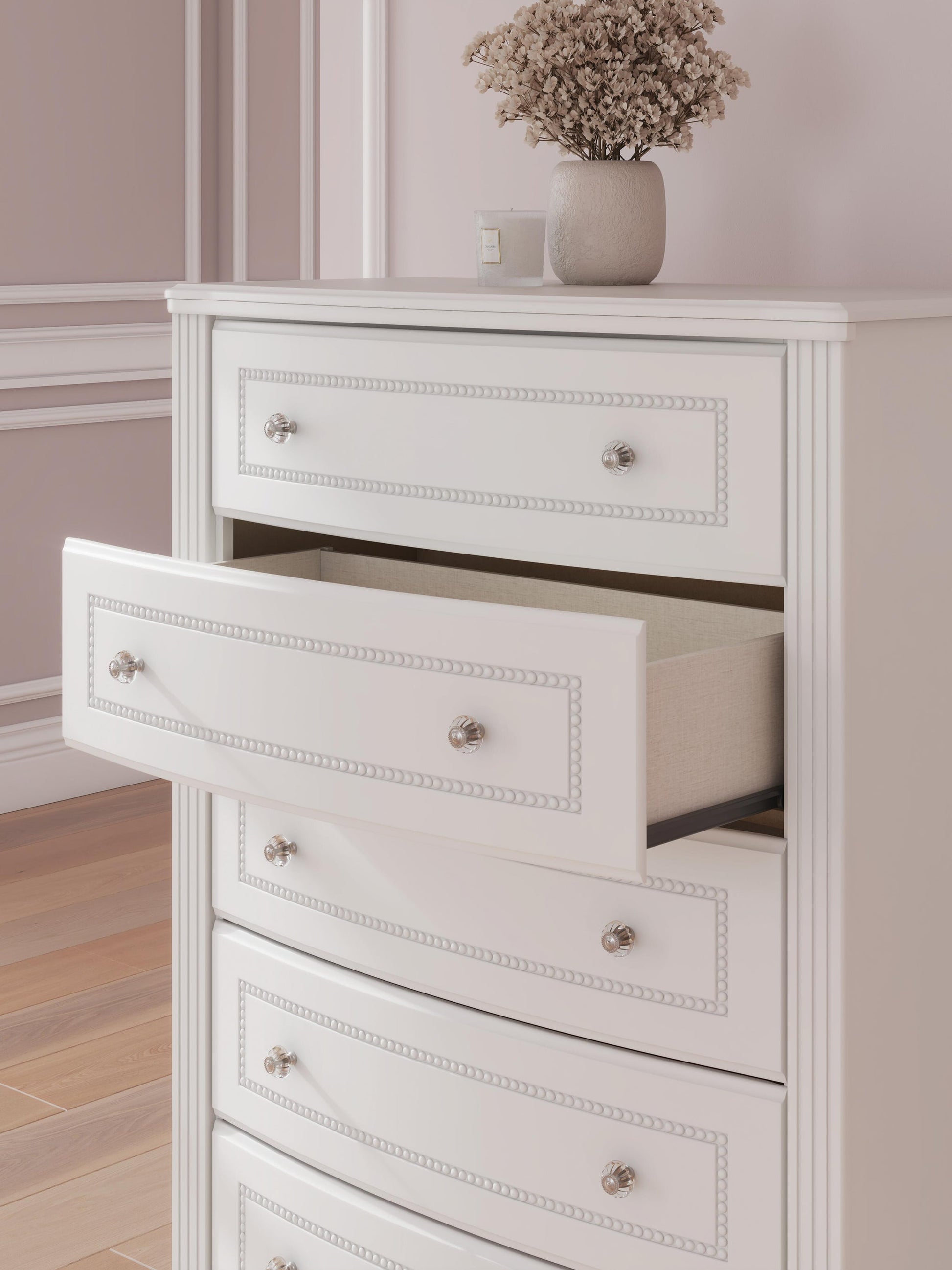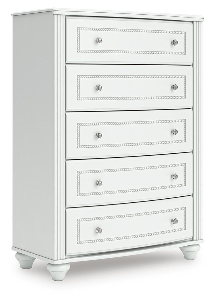 Fit for a princess. This chest of drawers’ crisp matte white finish pairs with charming elements like bun feet, crystal knobs and ornate beading—the perfect crowning touches for your girly girl. This spacious five-drawer piece is sure to make your little one feel like royalty.