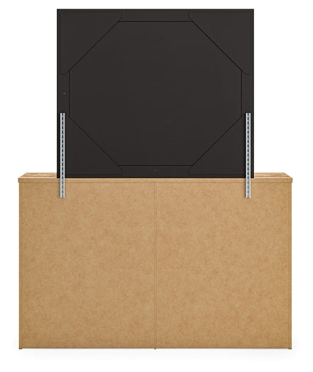 Approachable in character, this dresser and mirror embody fresh style that inspires. A warm finish and replicated oak grain invite with homey charm, while details like sleek drawer pulls lend a contemporary attitude. From urban chic to modern farmhouse, this versatile piece seamlessly reflects your eye for design.